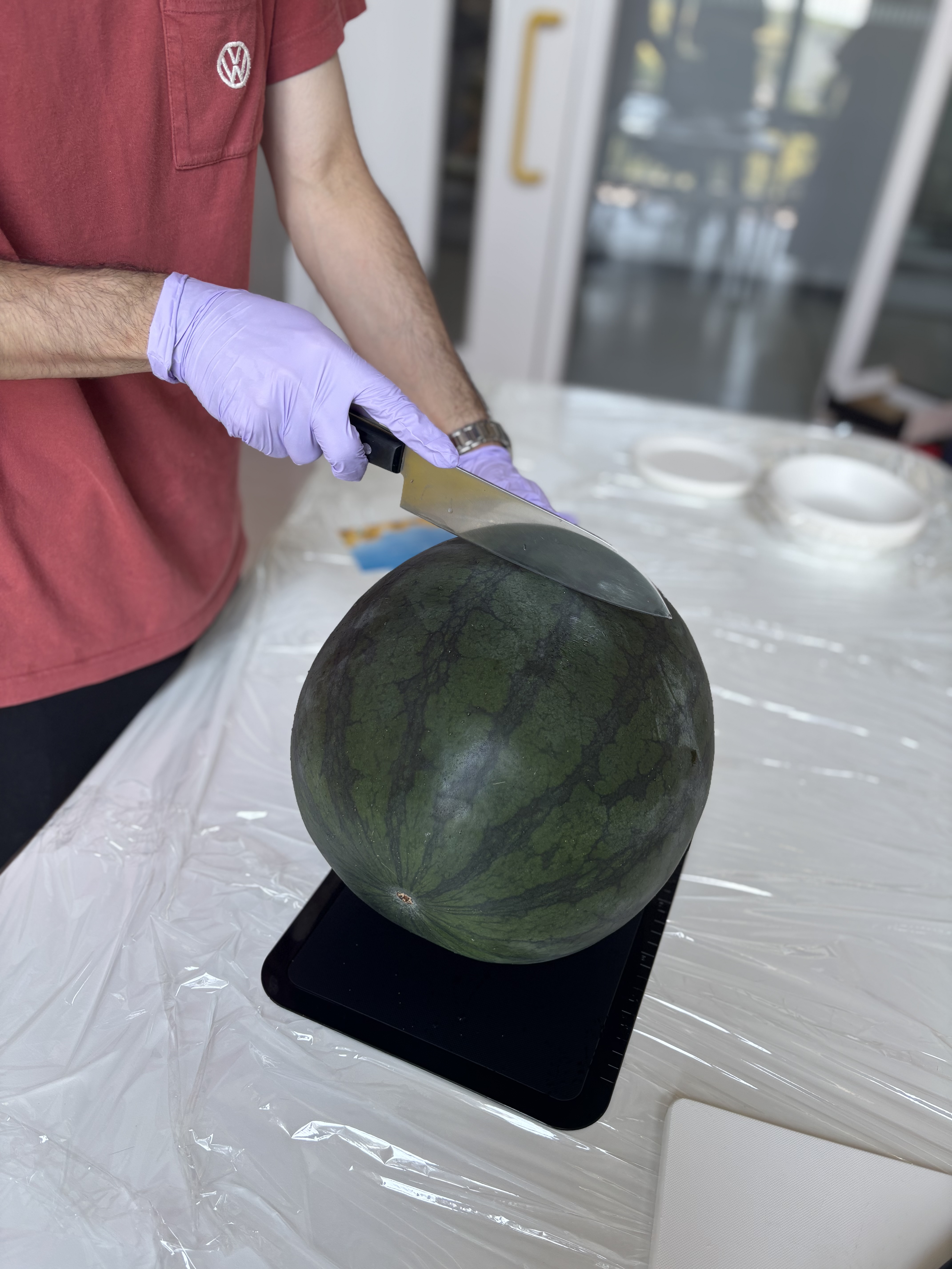 - Kawano博士から、大きな大きな「でんすけスイカ」が届きました。研究室の冷蔵庫でキンキンに冷やしてから切り分けて、みんなで有り難く頂きました。